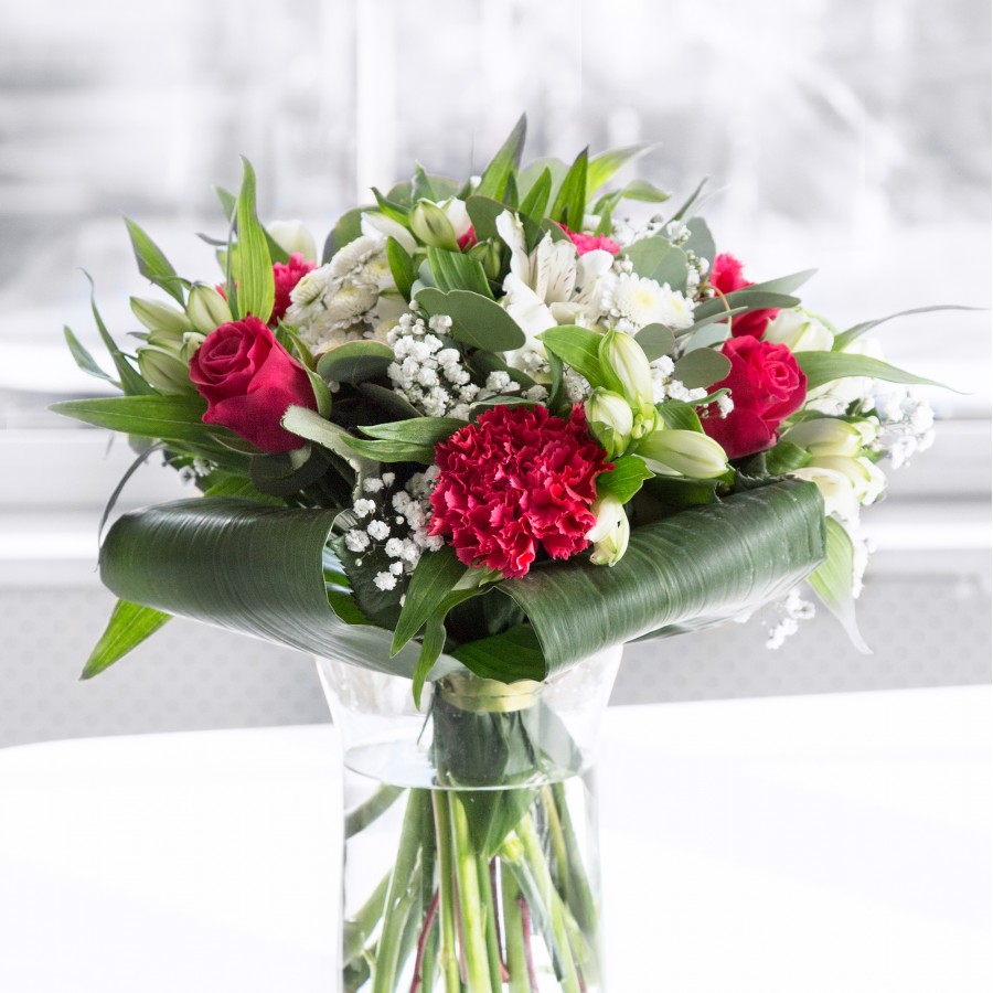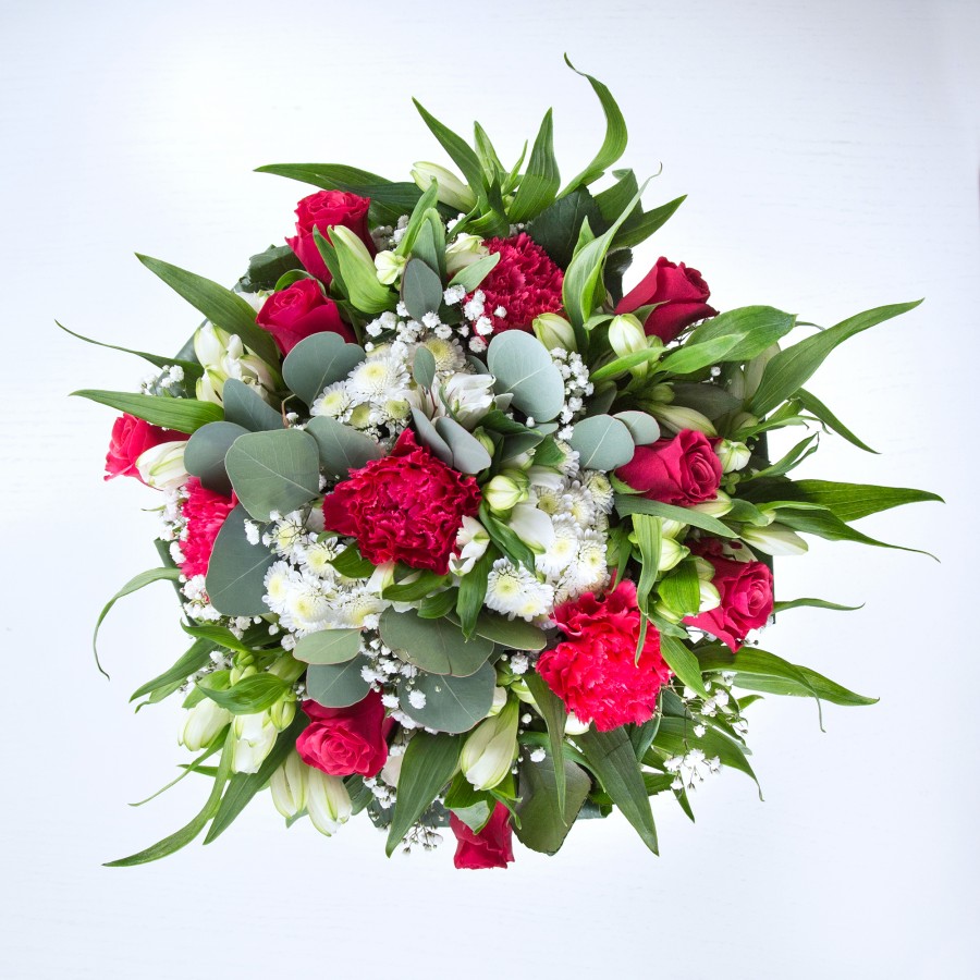 Embrace the unique beauty of our Sophisticated Grace Bouquet. This elegant arrangement combines white chrysanthemums, gypsophila, and red roses, beautifully interwoven with carnations and lush greenery.