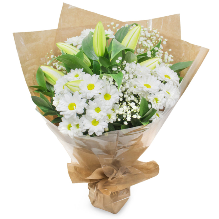 Our elegant bouquet combines beauty and uniqueness with snow white lilies, white chrysanthemums, and graceful gypsophila. The gorgeous design ensures it’s a memorable and luxurious gift for any occasion.