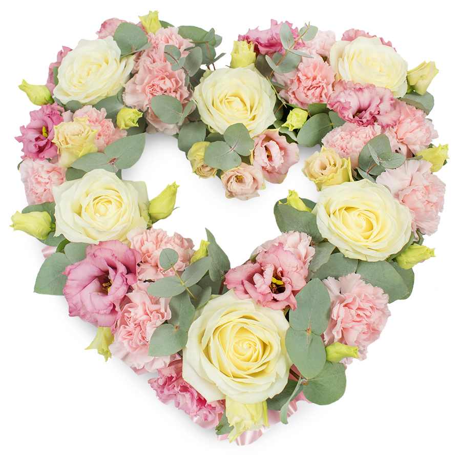 Express your sympathy with our beautiful open heart arrangement. Featuring a harmonious blend of white roses, pink carnations, pink lisianthus, and eucalyptus, each flower is carefully hand-selected to ensure utmost freshness and quality.